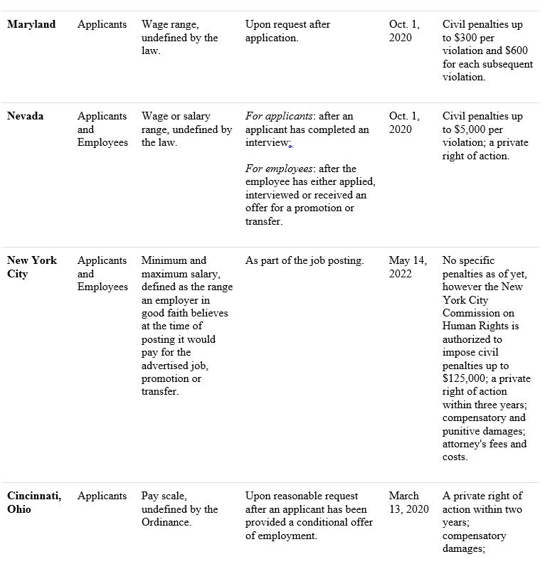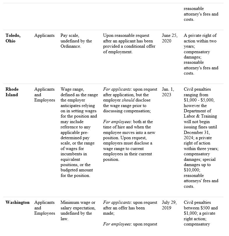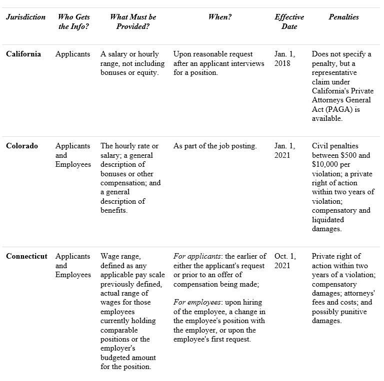 “Employers in 10 jurisdictions (and counting) are now subject to wage disclosure requirements. Colorado and New York City have made headlines as the first jurisdictions to mandate such disclosures. Employers must review the laws of each individual jurisdiction to remain compliant with this growing collection of wage disclosure laws. The following table provides an overview of these jurisdictions and what they require: