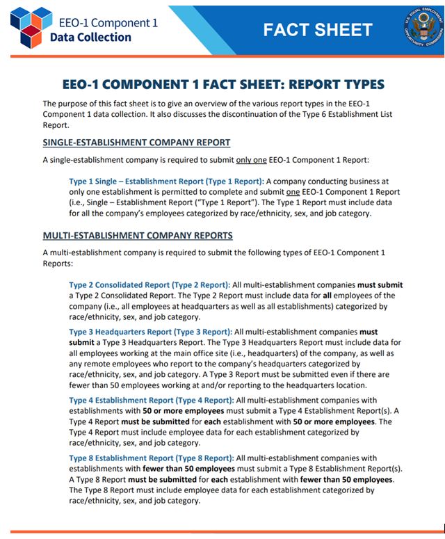 Single-establishment companies are required to submit only one EEO-1 Component 1 data report. Multi-establishment companies must submit: