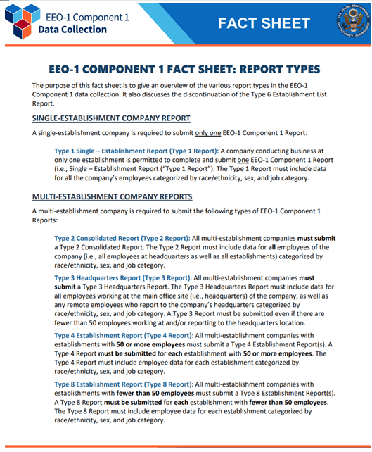 Single-establishment companies are required to submit only one EEO-1 Component 1 data report. Multi-establishment companies must submit: