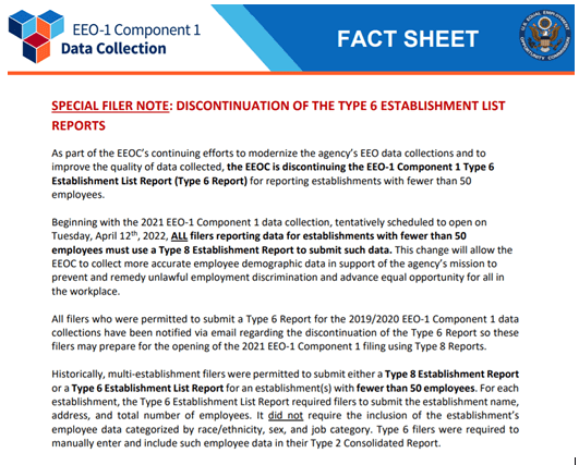 The EEOC also announced the discontinuation of the use of Type 6 reports for multi-establishment employers. Type 6 reports allowed these employers to report only the total number of employees at an establishment with fewer than 50 employees, instead of providing demographic data by EEO-1 category for each location.