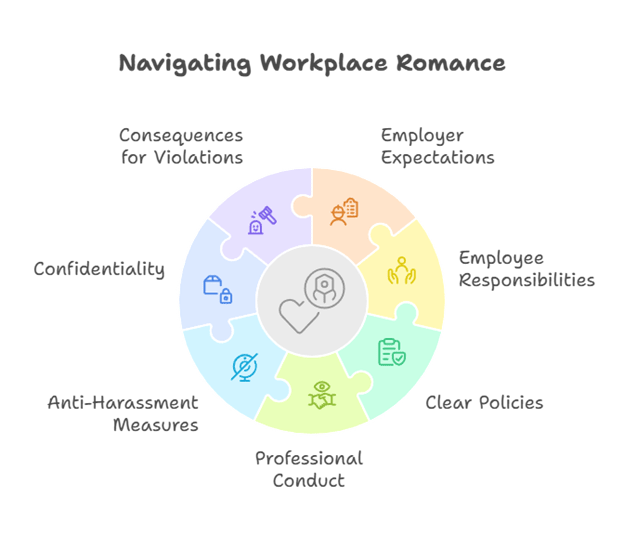 • Understand the Risks: Be aware that workplace relationships can lead to gossip, perceptions of favoritism, and complications if the relationship ends.
